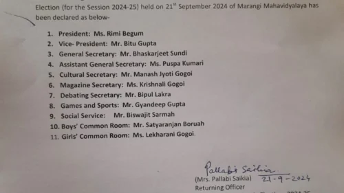 Programme 1st Sessional Examination, 2024-25September 5, 2024Students Union Election 2024-25September 21, 2024 Published by admin on September 21, 2024 Categories Events Tags Share0 admin Related postsMarch 8, 2025Women day celebration at Marangi Mahavidyalaya by women cell of the college , in association with NGO -‘Amar xopun. On 8.3.25Read moreMarch 7, 2025Add on course on ‘Reading Ethnography ‘ has started by department of Sociology on 7.3.25Read moreMarch 7, 2025Today on 7.3.25. , department of Political science has started their add on course on Rural Economy.Read more Leave a Reply Cancel replyYour email address will not be published. Required fields are marked *Comment * Name * Email * Website Save my name, email, and website in this browser for the next time I comment.